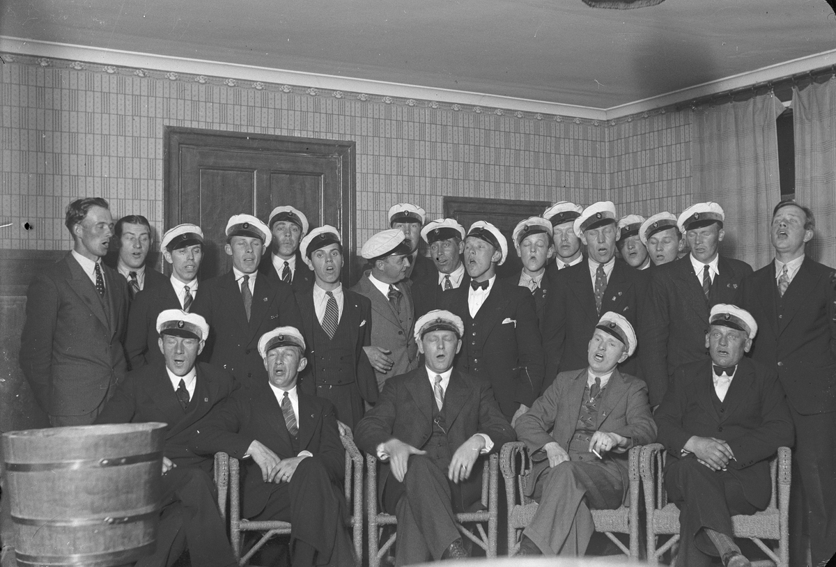 Kilafors sångarbröder. Nya Hotellet i Kilafors, valborgsmässoafton i mitten av 30-talet. Helmer Fohlin, Alvar Bergström, Victor Johnsson, Emil Johansson, Eric Jonsson, Helmer Hellsten, Pettersson (anställd hos slaktar Victor Olsson, Norrsätter), Erik Andersson, Lars Jonsson, Rickard Moberg, Sigvard Hedberg, Karl Larsson, Evald Sallander, Alex Olsson, Valfrid Brodin, Sven Norin, Ivar Bergström, Birger Smith, Rolf Hjorth (dir.) Evald Moberg, Gustav Rask