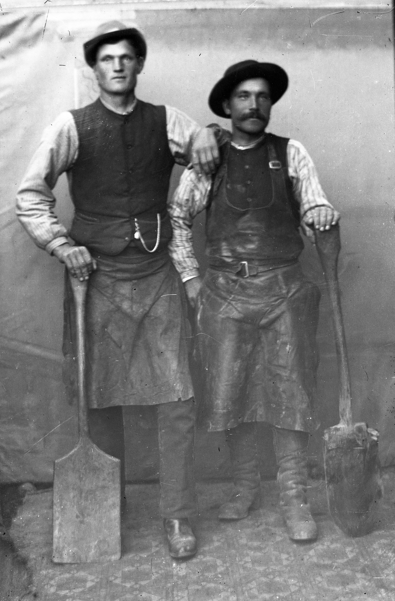 Två män från Hedesunda. Med skinnkläder och spadar.