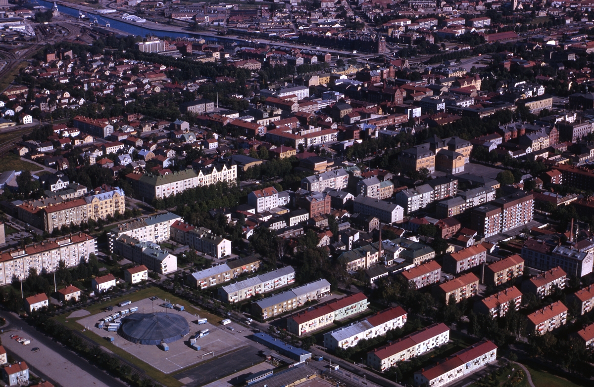 Flygbild över Gävle, norra stadsdelen. Nynäs idrottsplats i bildens vänstra hörn.
