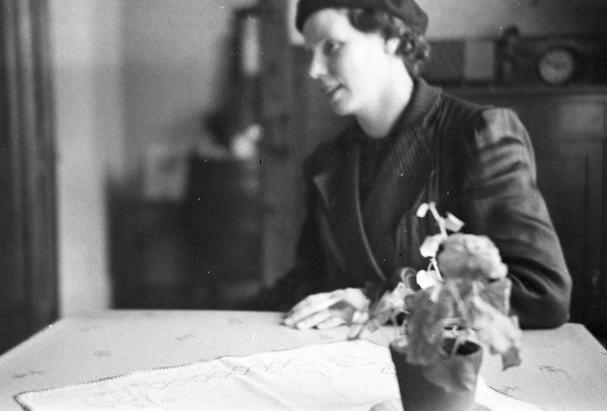 Kvinna vid köksbordet. (Bilden något suddig).