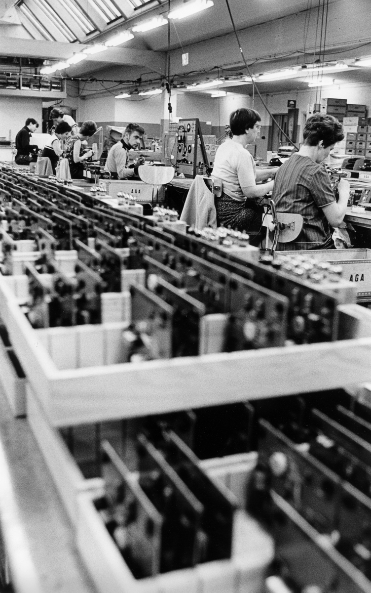 Titel: Interiör från AGA-fabriken i Gävle. Från utställningen "Gävlar i stan" på Gävle Museum 1967.