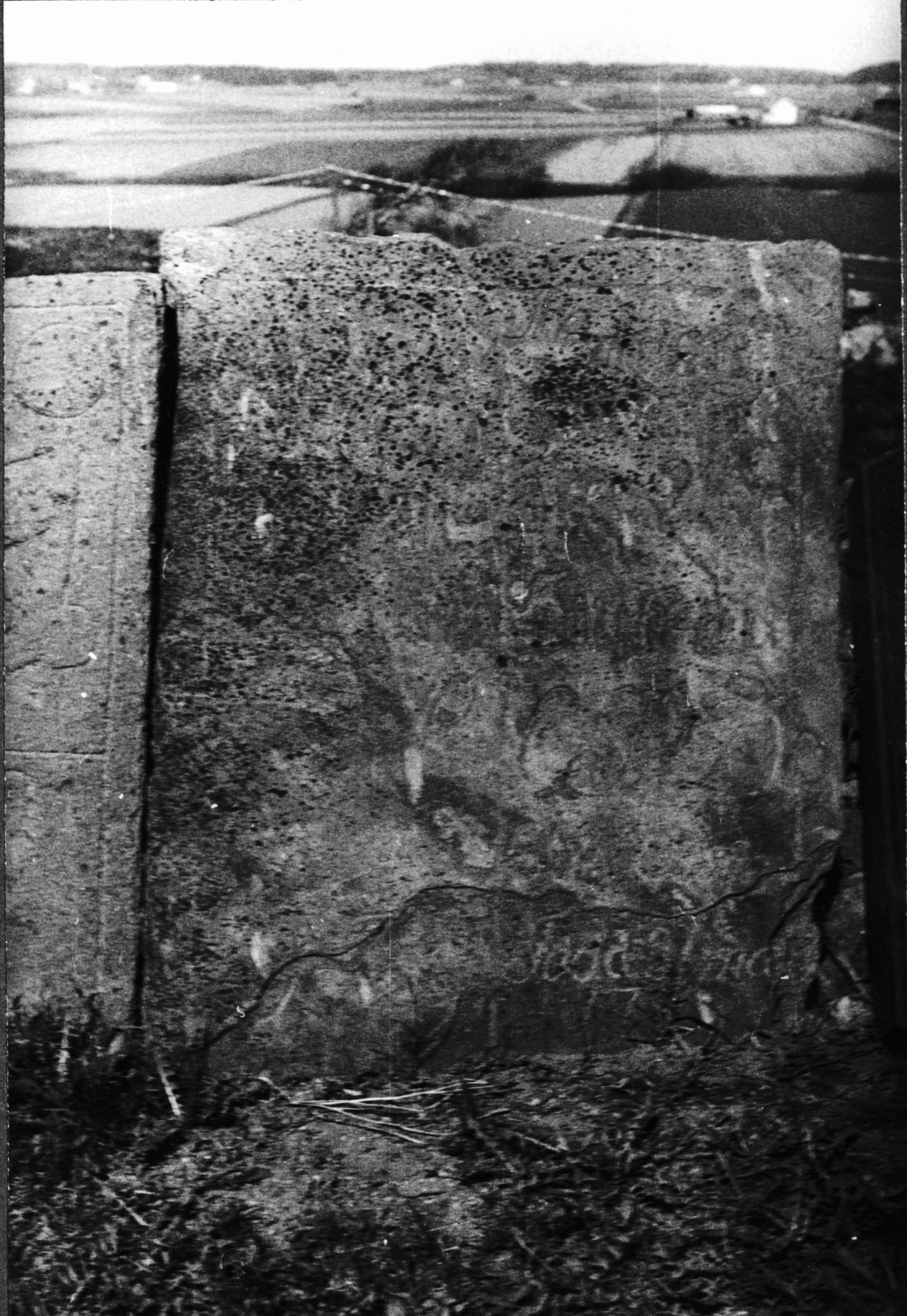 Gravhäll använd som trappsten vid ingången. Från 1600-1700-talet.