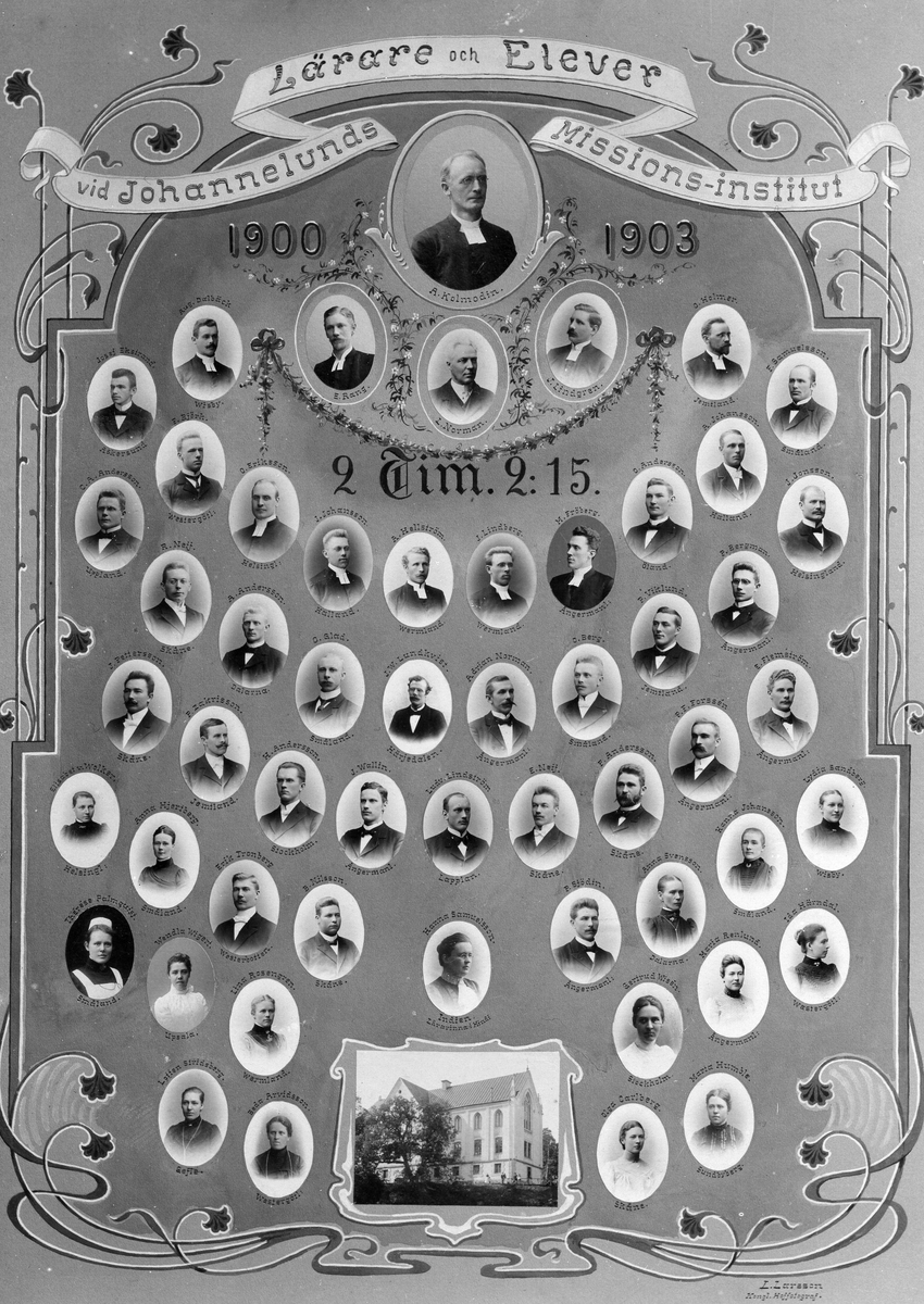 Lärare och elever vid Johannelunds Missionsinstitut, 1900 - 1903. Kabinettkort. Lärarinna i Hindi, Hanna Samuelsson, Indien.