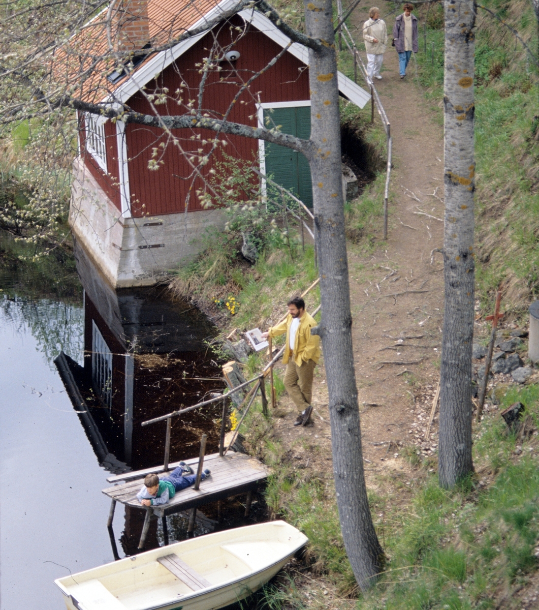 Naturstig, båt och brygga i vatten, Tallbo, Järbo