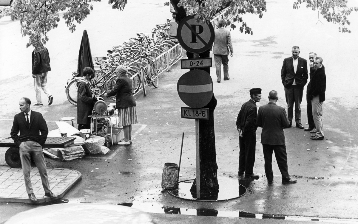Stortorget. Gävle. "Här stöter man på bekanta, väntar på att en telefon blir ledig, köper en lott i kaffetombolan". Bilden finns med i boken "Ett 4faldigt leverne". Text Allan Lundberg och Foto Svante Hedin. Från utställningen "Gävlar i stan" på Gävle Museum 1967.