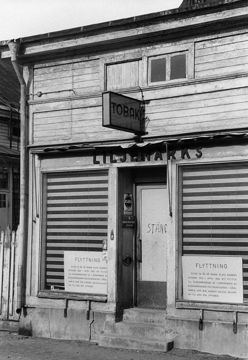 "Flyttning. Efter 50 år på denna plats kommer den 1 april 1966 att flytta till Ruddammsgatan 49 (korsningen av Ruddammsgatan-Fältskärsgatan 1) Såväl gamla som nya kunder hälsas välkomna till den nya affären". Från utställningen "Gävlar i stan" på Gävle Museum 1967.
