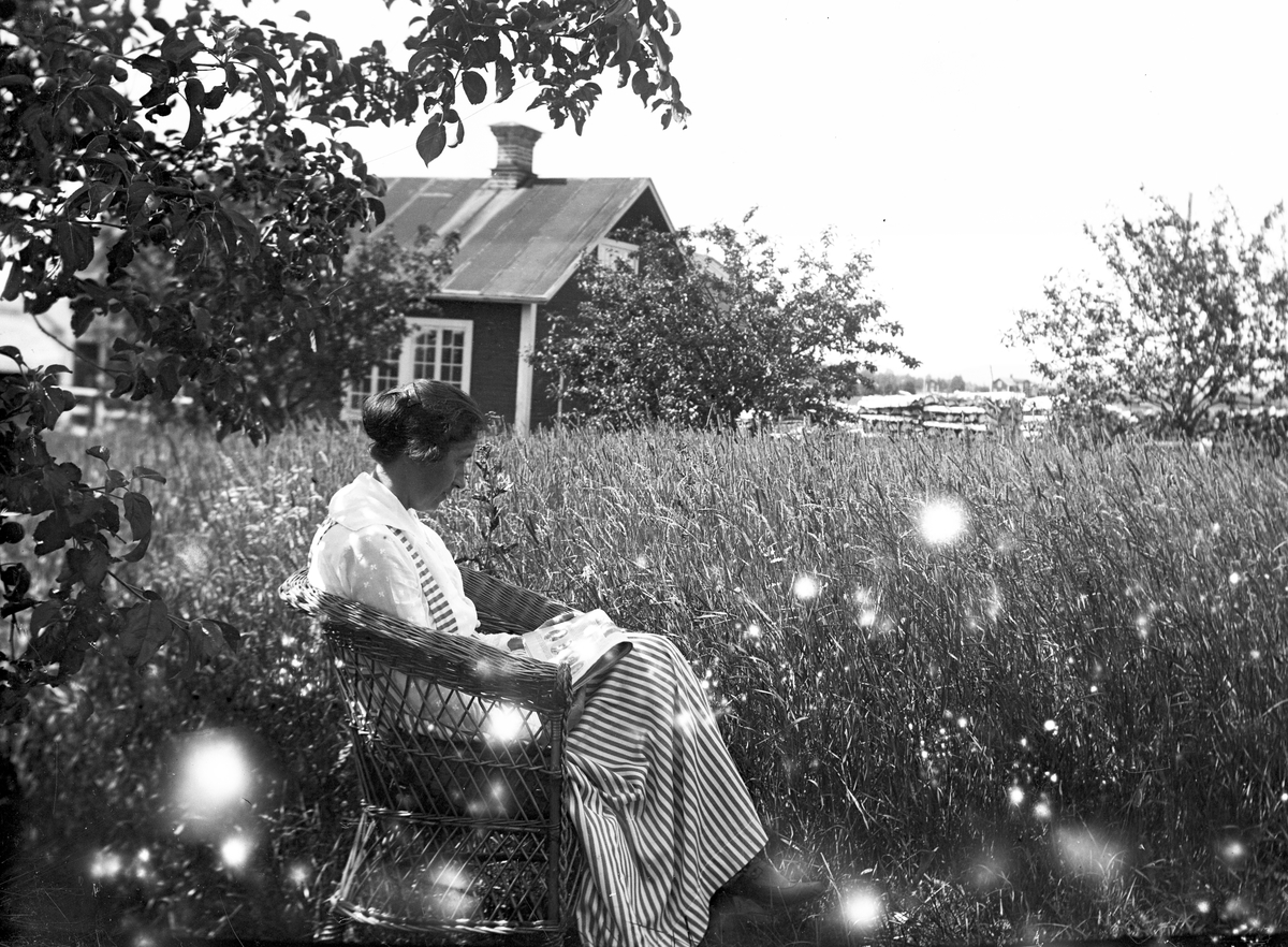 Sitter och läser. Tidsomfånget är 1900 - 1940