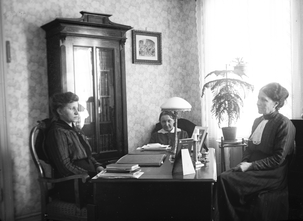 Sitter vid skrivbordet. Tidsomfånget är 1900 - 1940