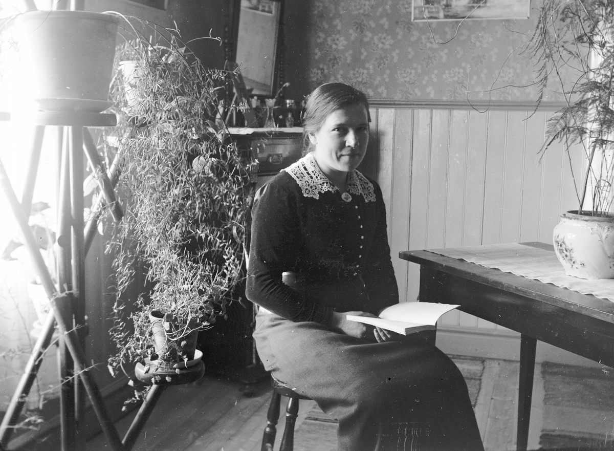 Sitter och läser. Tidsomfånget är 1900 - 1940