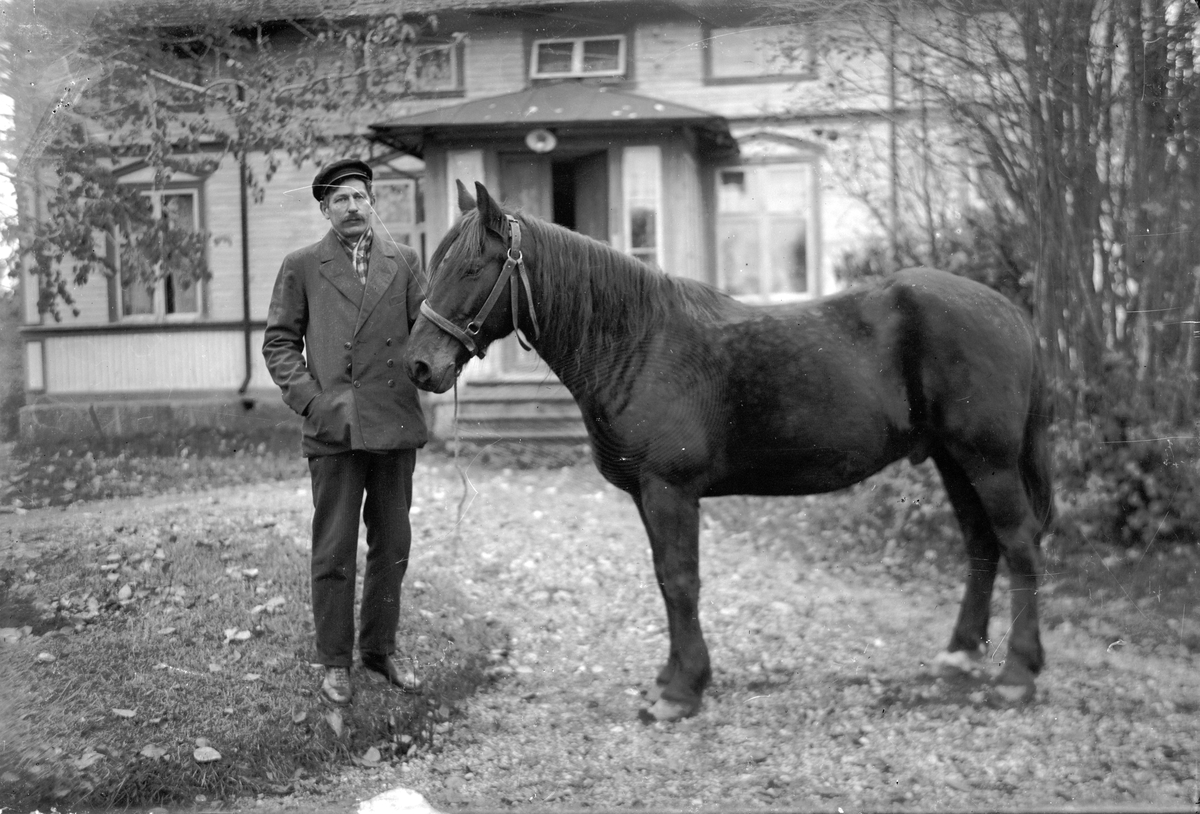 Man med häst, utanför bostadshus.