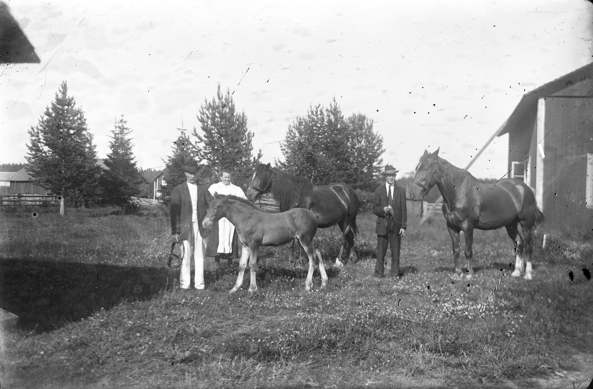 Två män, en kvinna och hästar.
