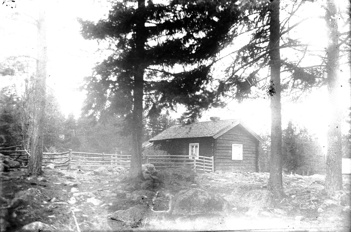 Stuga i skogsmiljö.