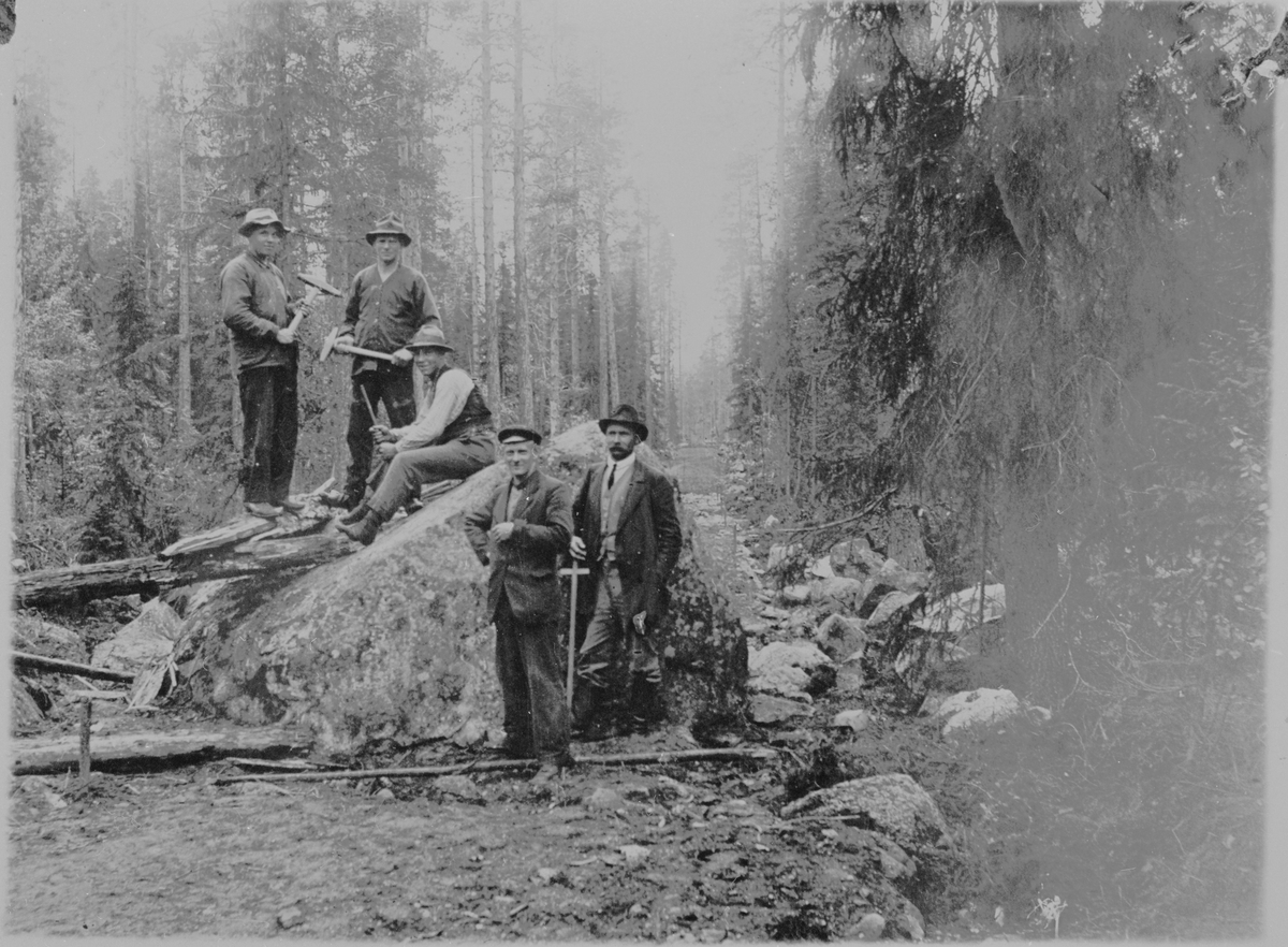 Män med släggor, som bryter sten i skogen.
