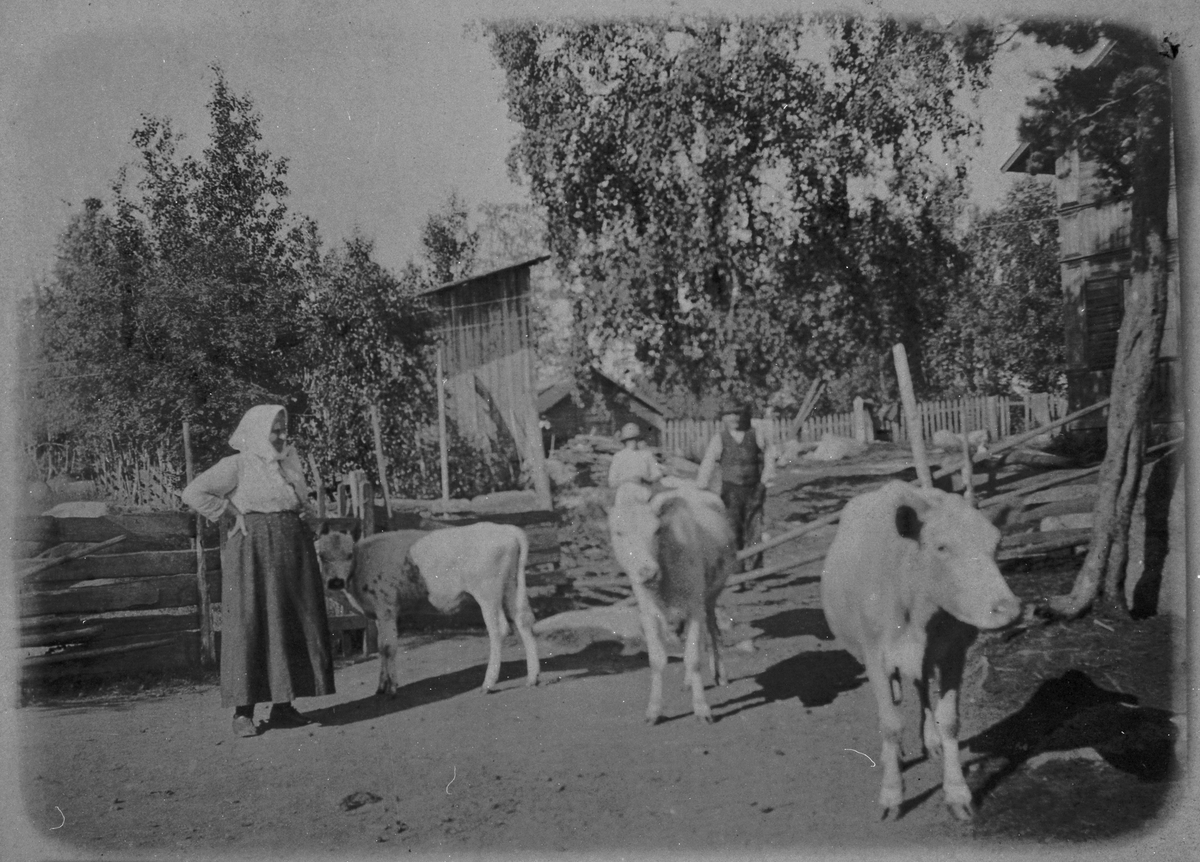Titel: Anders Perssons kor som ska till skogs. Karin Persson går i täten och Anders och Gertrud Björk föser på.
