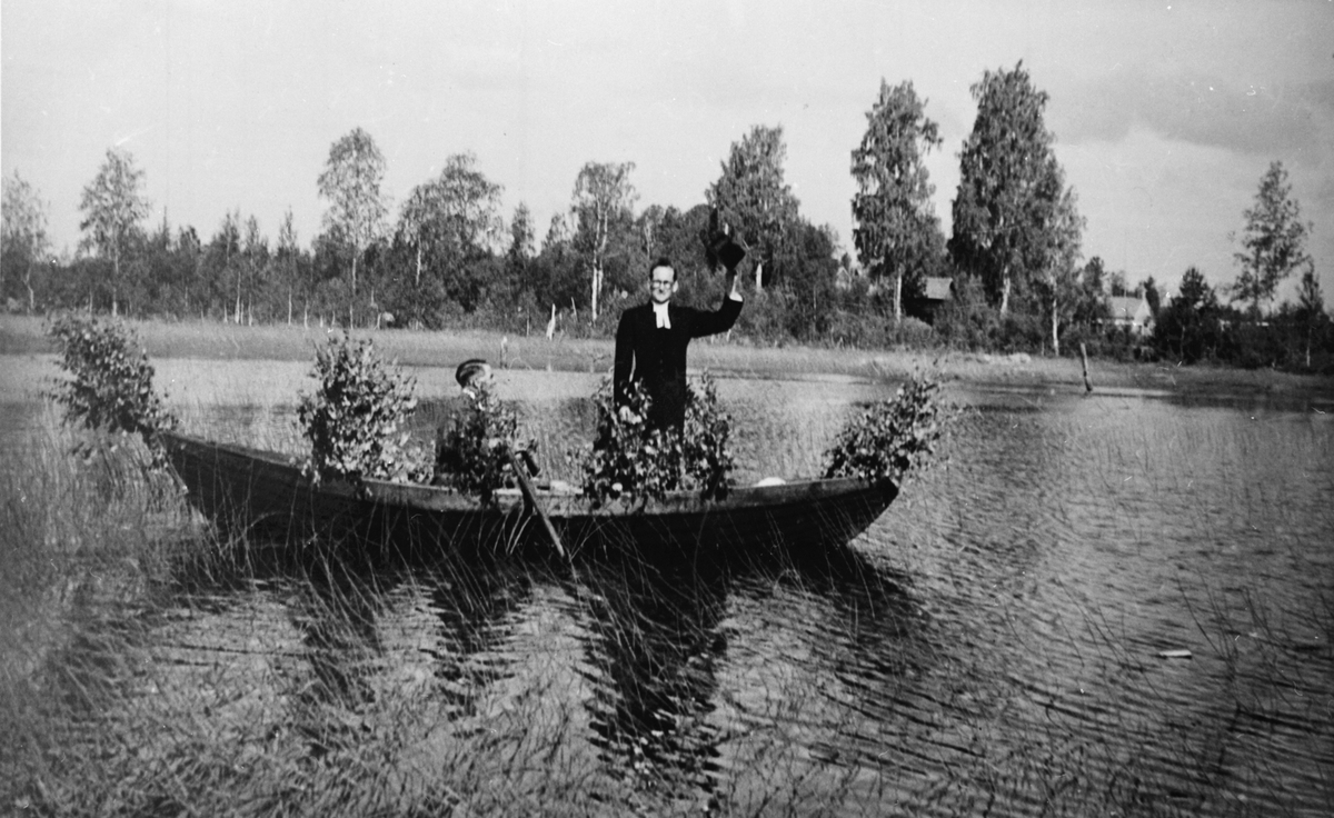 En präst, i en lövad eka.