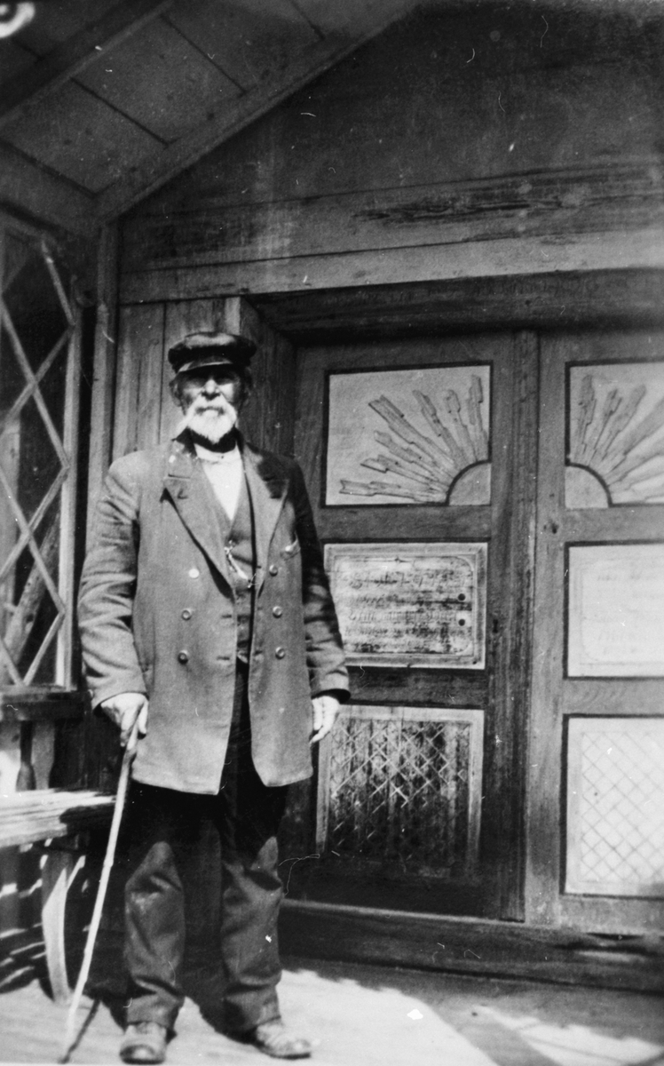 Äldre man vid en dörrport.