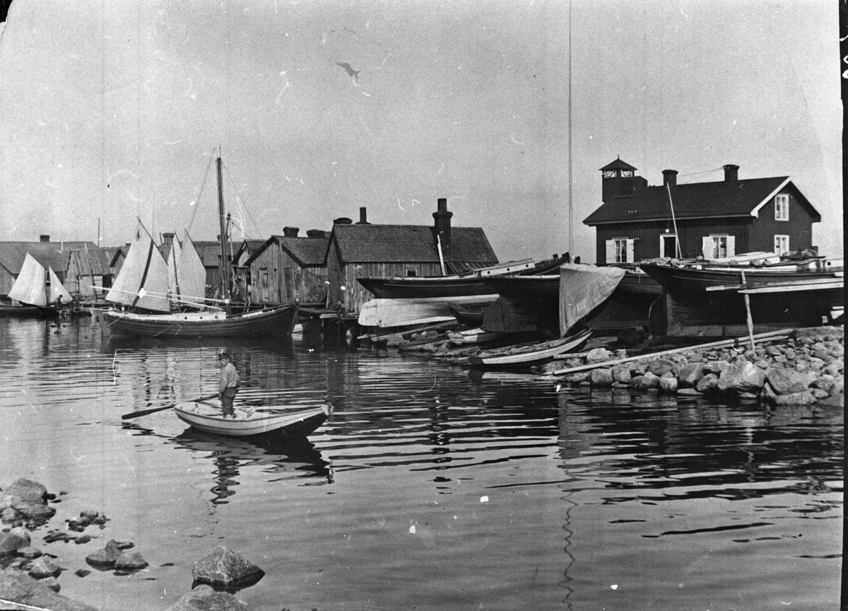 Båtar, samt en pojke som står i en eka, sjöbodar och ett fyrhus.