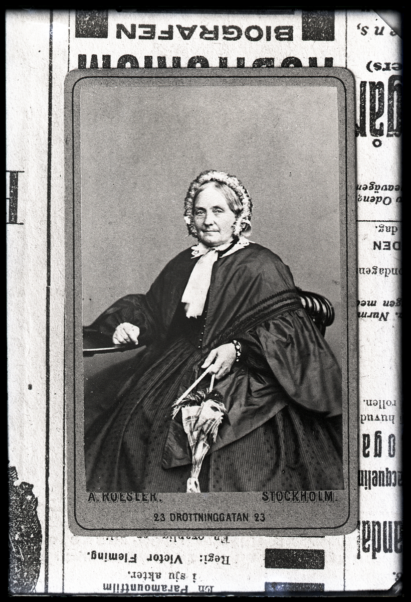 Kvinnoporträtt. Fru Celsing. Reproduktion, visitkort. Fotograf August Roesler, Drottninggatan 23, Stockholm.