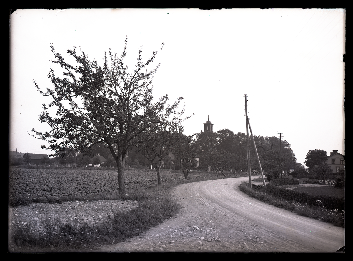 Grusväg med kyrka i fonden. (Kolbäcks kyrka?) Dir. Folmer, Västerås.