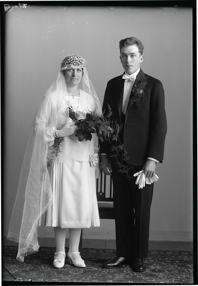 Titel: Brudpar, Einar Andersson, Hällsta, Svedvi, Hallstahammar. Ur Gustaf Åhmans samling.