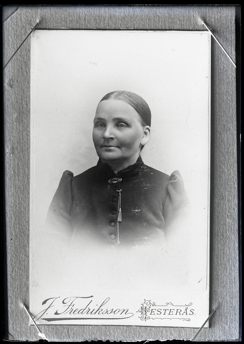 Kvinnoporträtt, visitkort. Algot Vinkler, Tomtebo 5, Hallstahammar. Fotograf J. Fredriksson, Västerås.