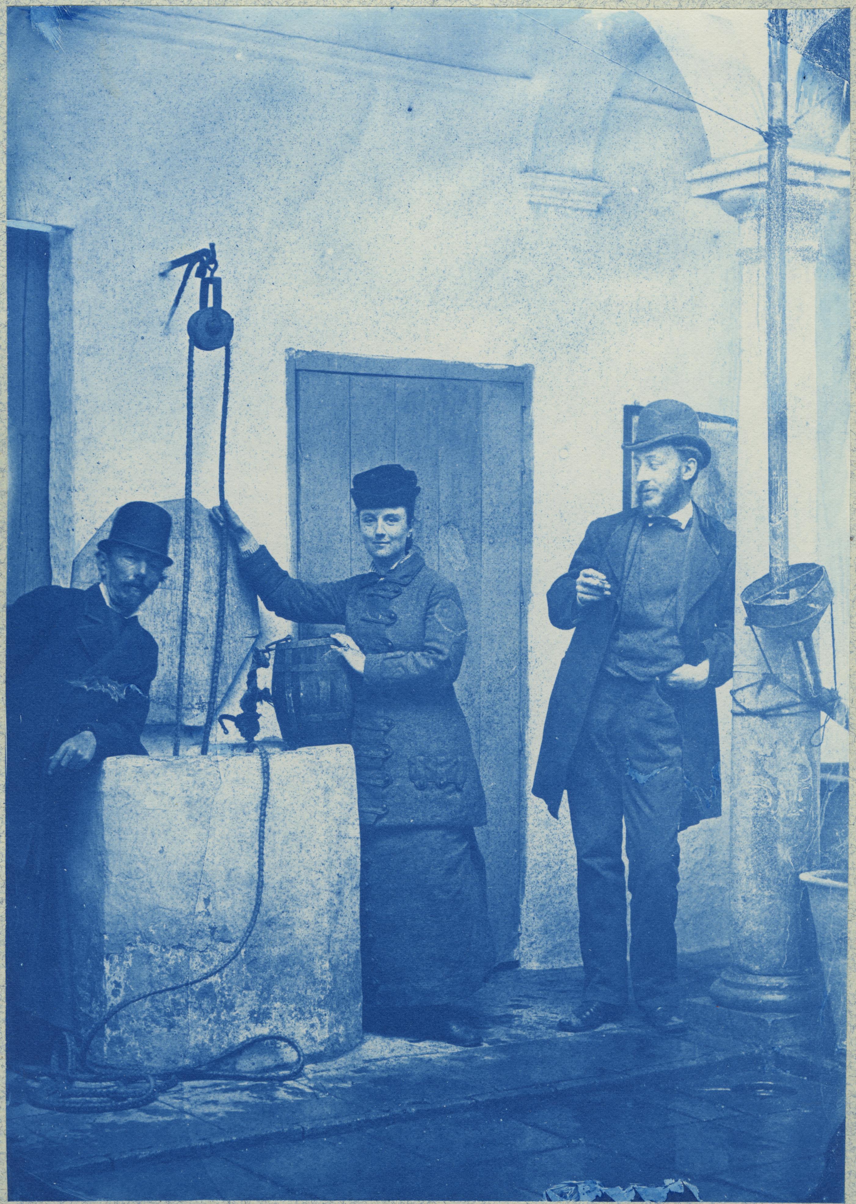 Calla Curman och två män vid en brunn, troligen i Andalusien.