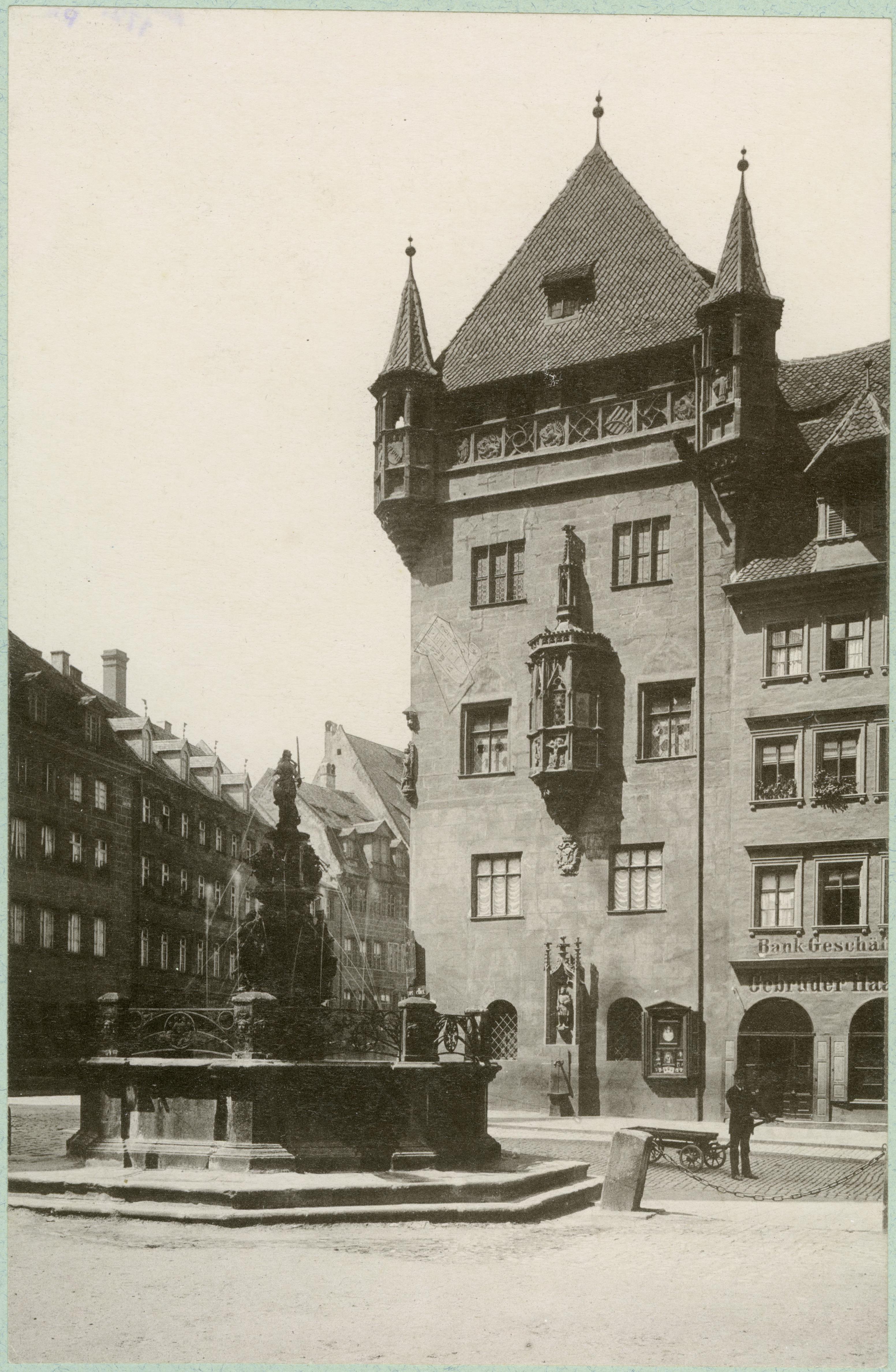 Nassauer Haus och brunnen Der Tugendbrunnen vid Lorenzer Platz.