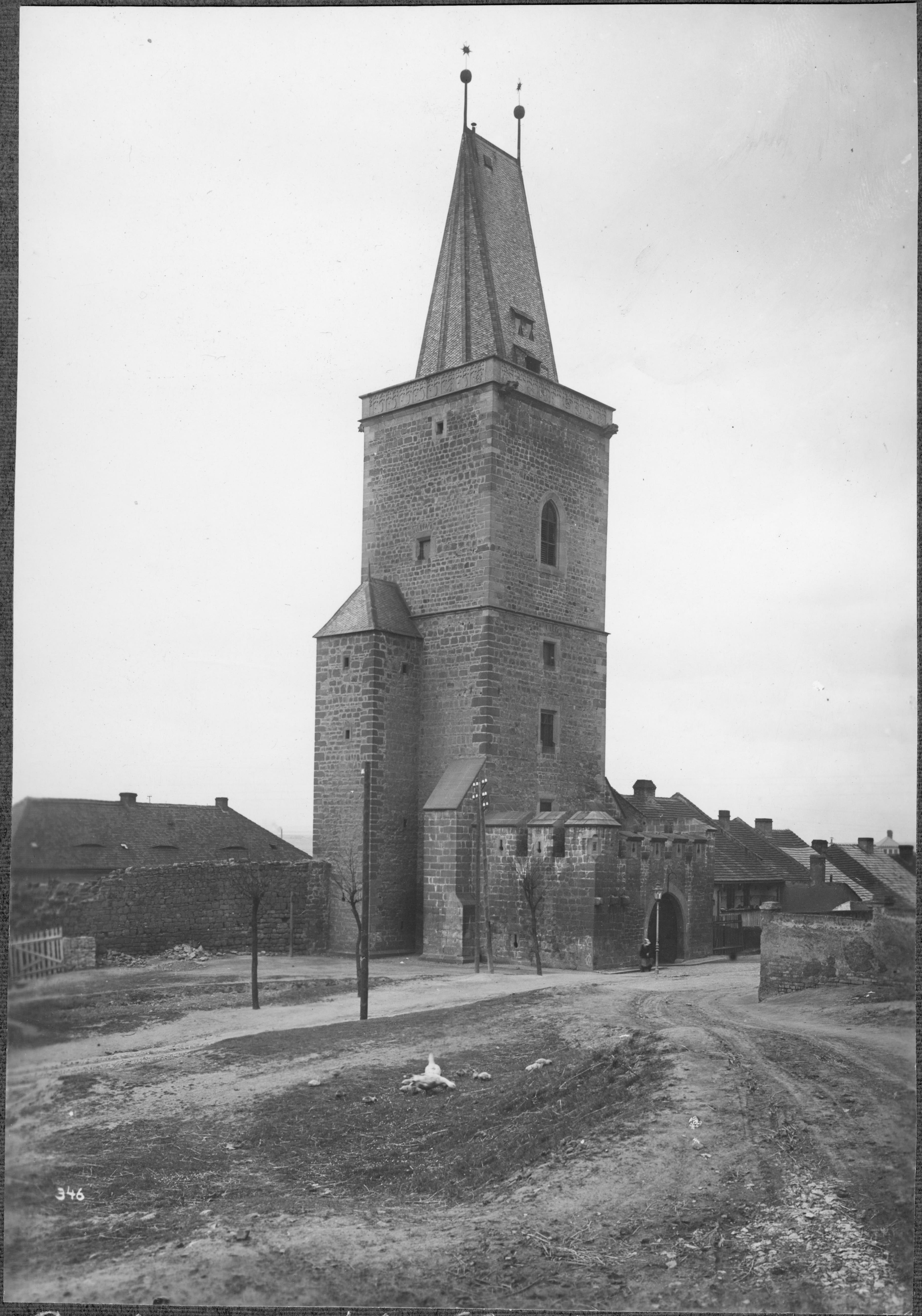 (Rakonitz), Böhmen. Stadsporten med försvarstornet Vysoká brána.