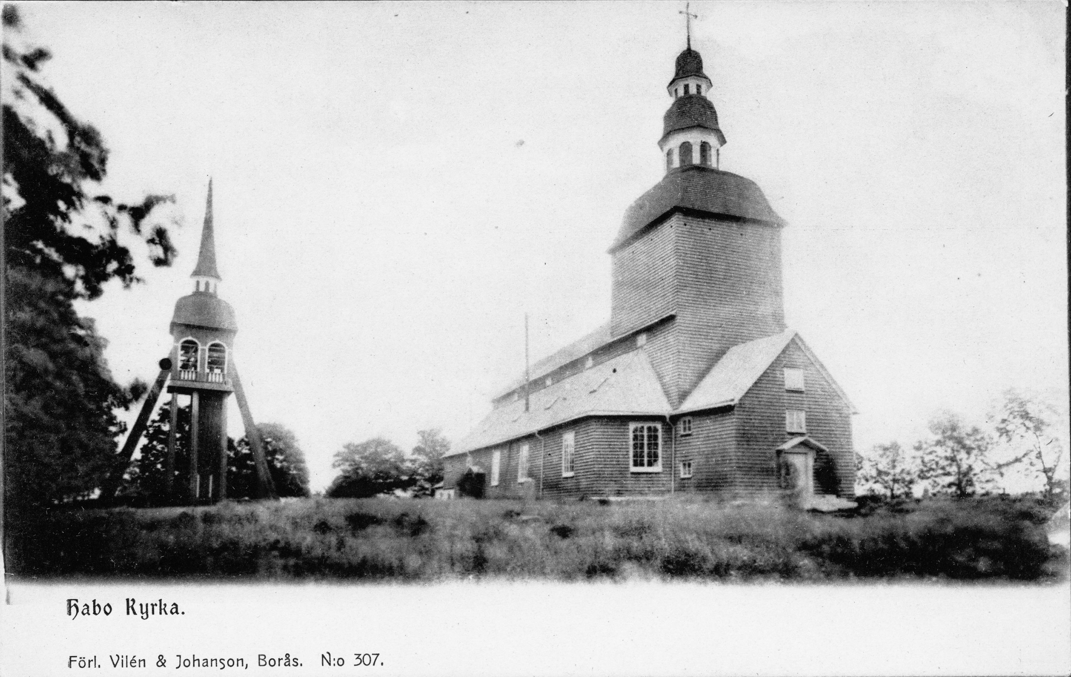 Kyrkan och klockstapeln från nordväst. Vykort.