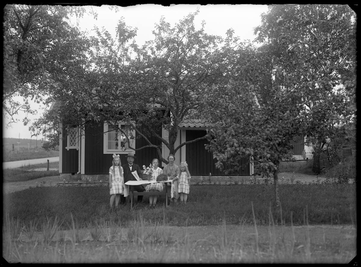 Grupporträtt, fem personer i trädgård. Brovakt Andersson, Kolbäck.