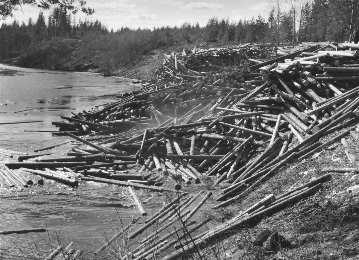 Timmerupplag för vårflottning. Testeboån, Åmotsbruk.