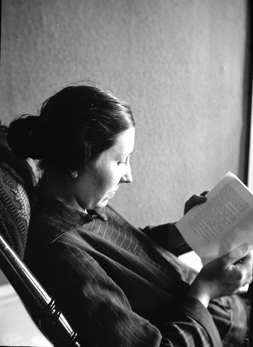Läsande kvinna i gungstol.