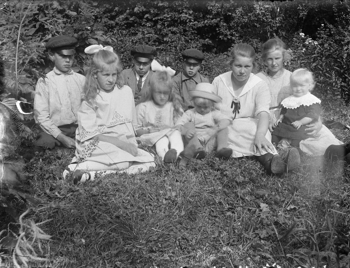 Barn och ung kvinna i gröngräset.