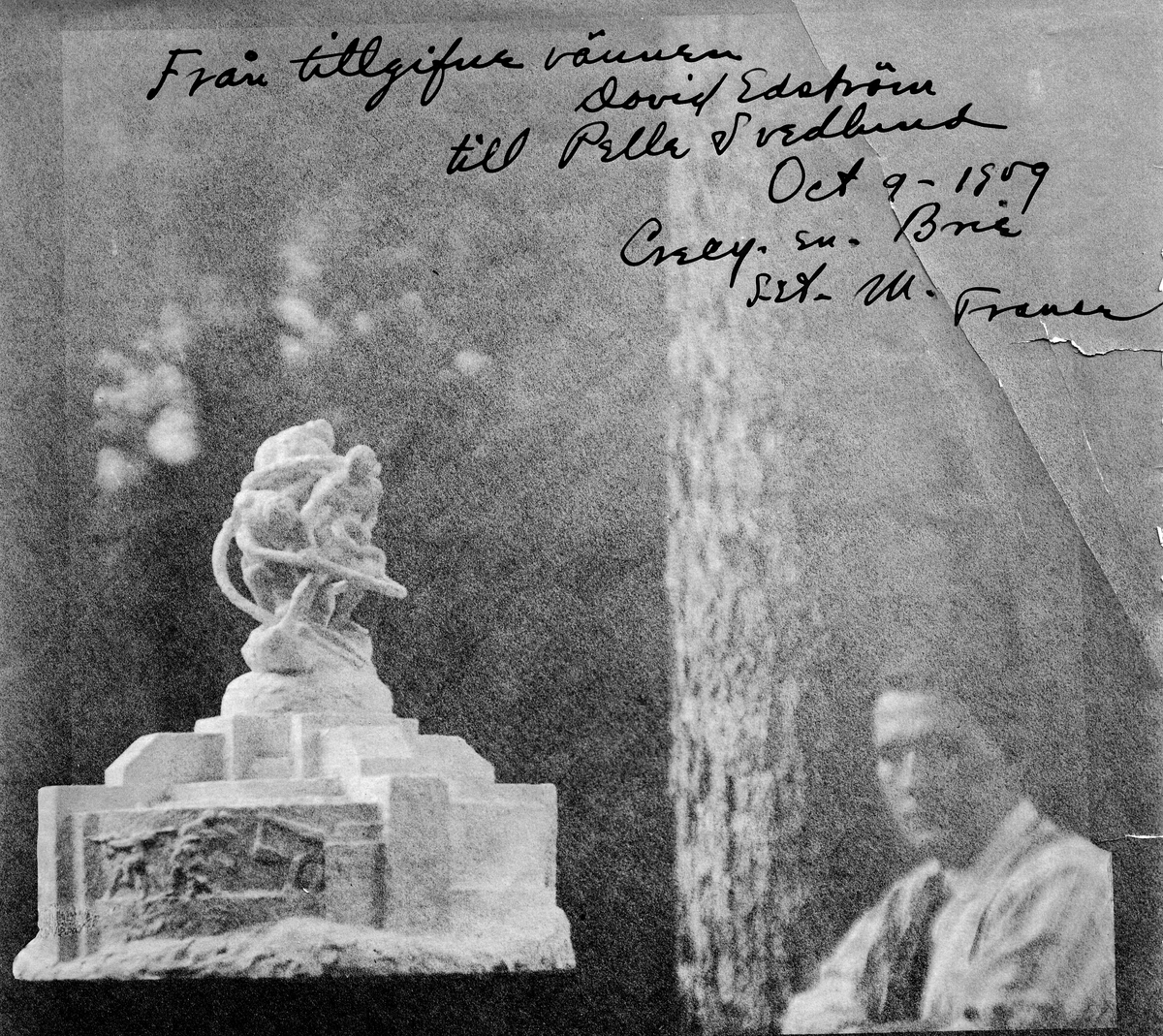 "Från tillgifne vännen David Edström till Pelle Svedlund. Oct. 9 - 1909". Ej säker på årtalet och vad som står sedan