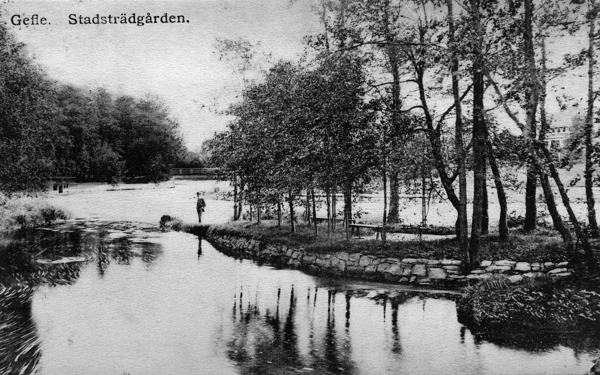 Gävle, "Gefle. Stadsträdgården". Ett brevkort Till Fru Lotten Bylund, Döbelnsgatan 29, 4 tr. Stockholm. Med texten "Får härmed underrätta att vi komma till Sthlm tisdagen den 29. med middagståget från Gävle. Hälsningar Elsa".