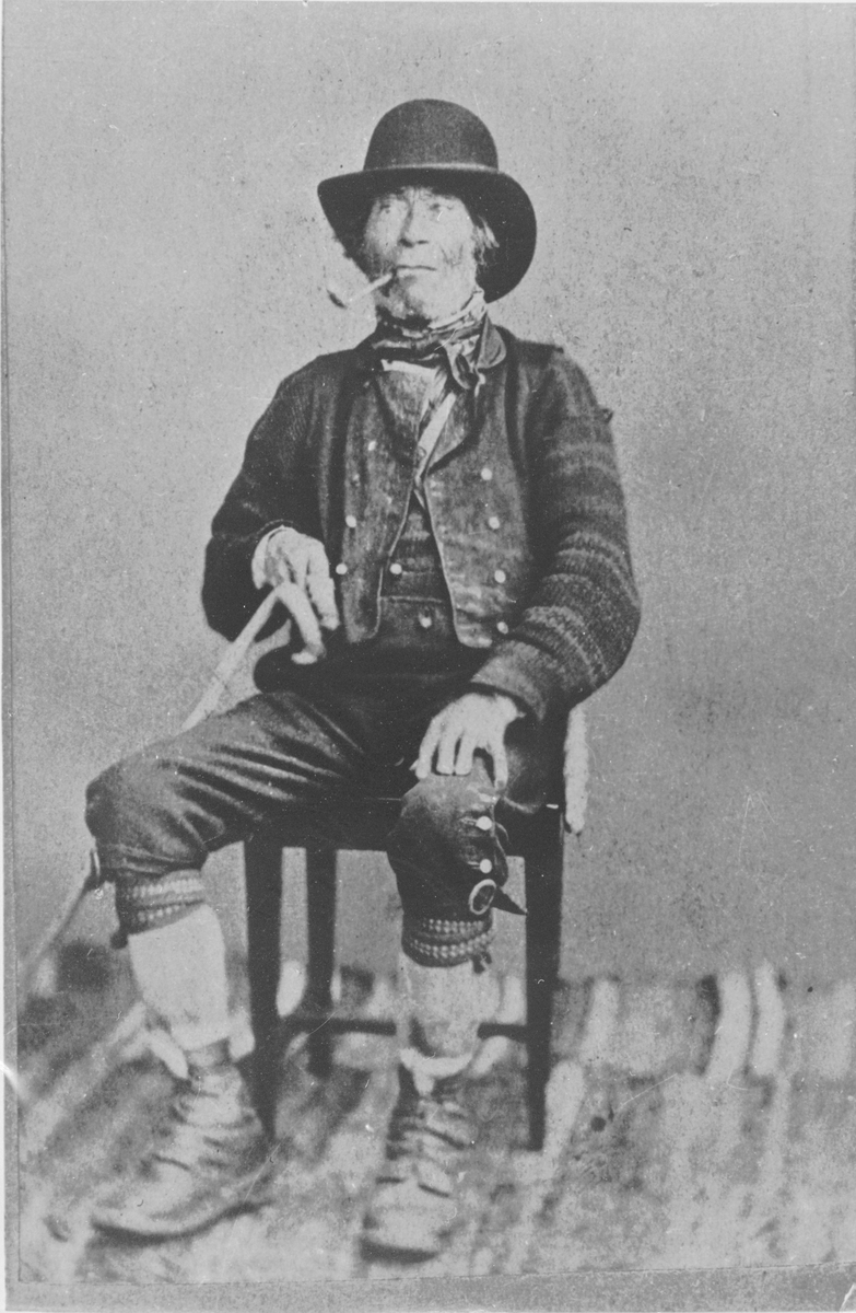 Porträtt på man med hatt, pipa och käpp.