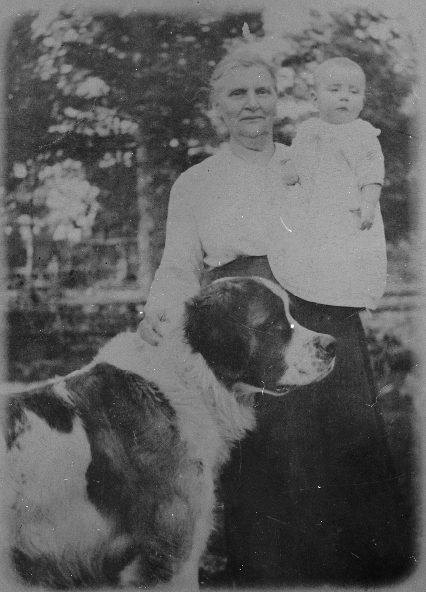 Äldre kvinna med litet barn och hund.