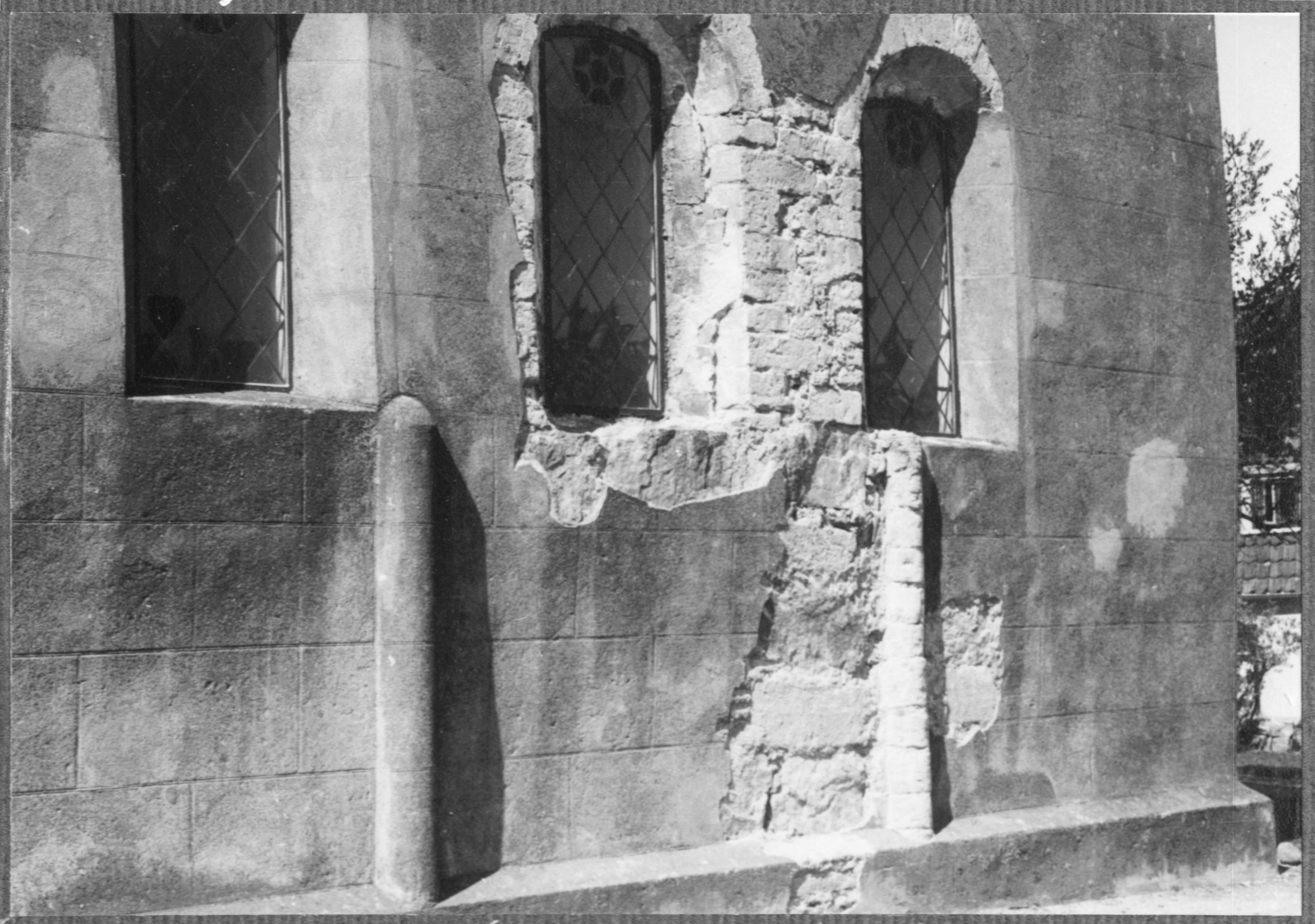Kyrkans korgavel. Till vänster orört 1800-talsfönster. Vid nedknackningen av puts.