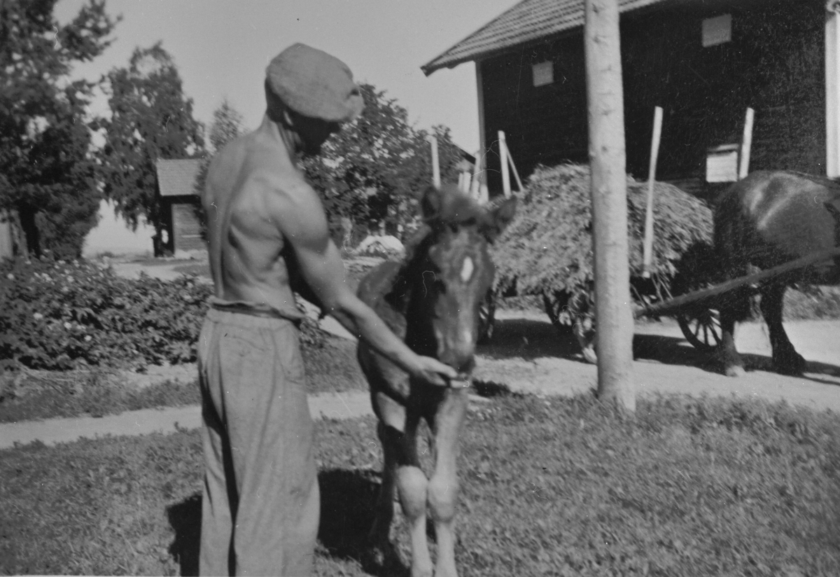 Man, som matar ett föl.