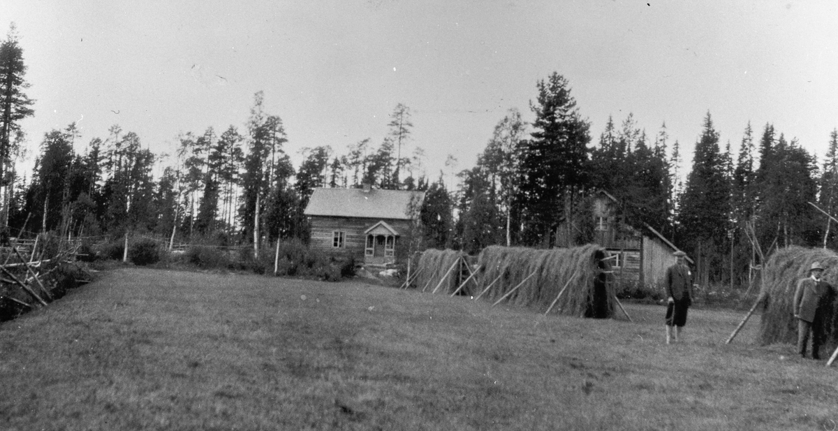 Titel: Karl Olssons kolonat, med hässjor framför stuga.
