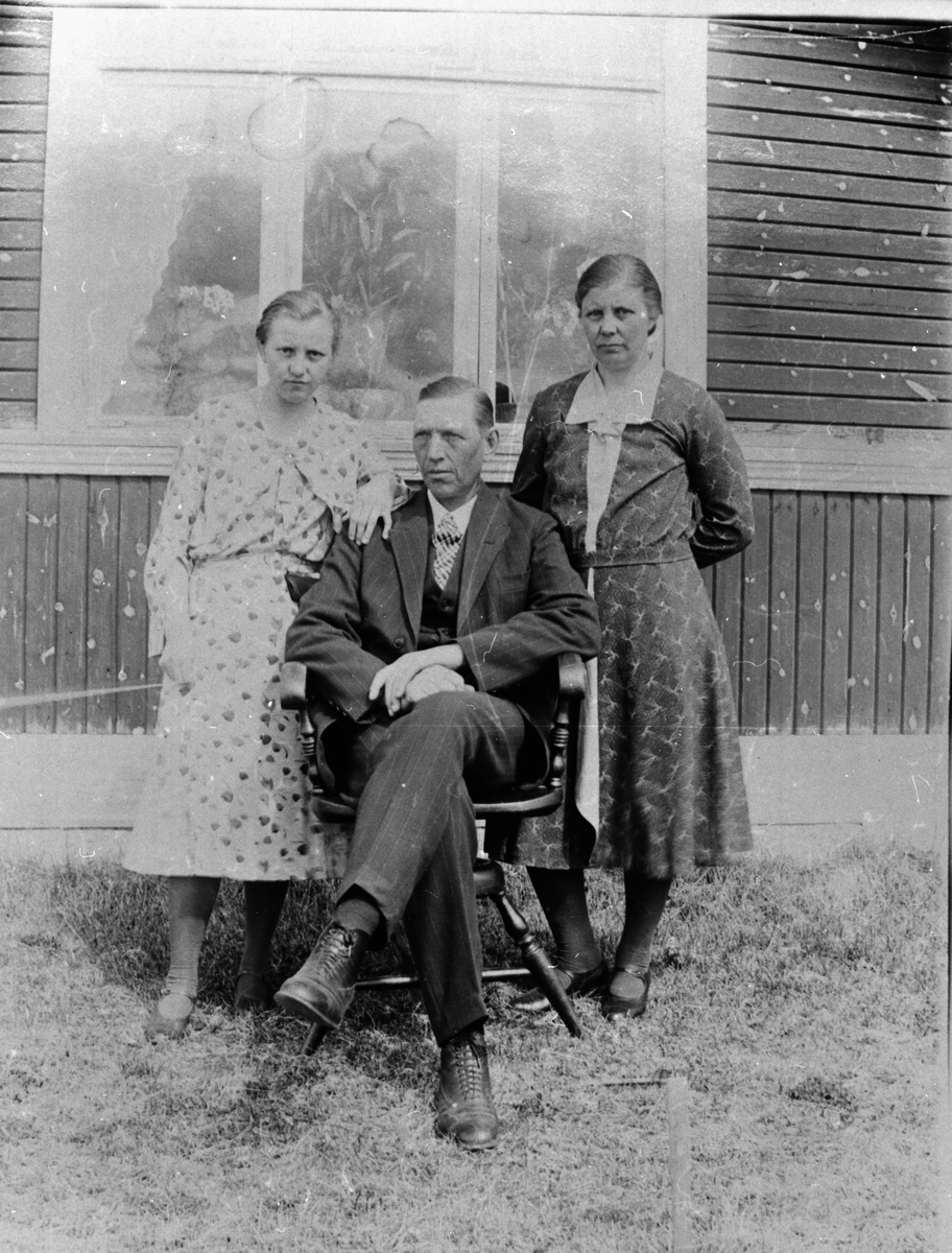 Två kvinnor och en man porträtterad, utanför ett hus.