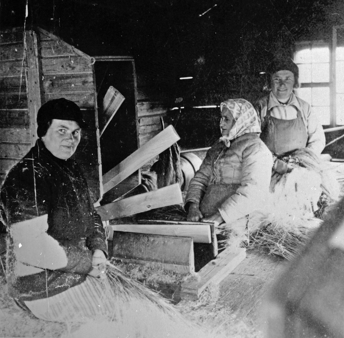 Titel: Tre kvinnor som skördearbetar.