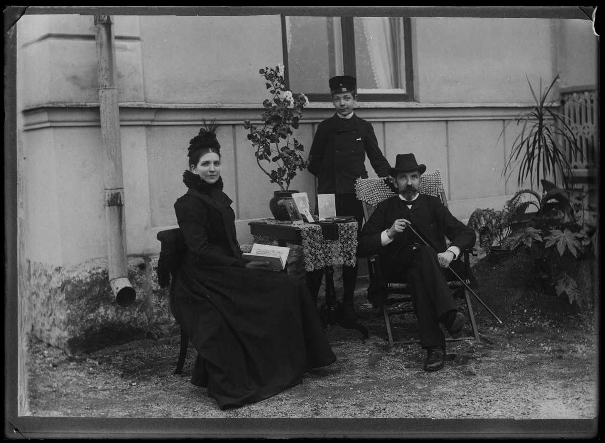 Grupporträtt, tre personer. Trädgårdsmästare Ekstrand, Kolbäck.