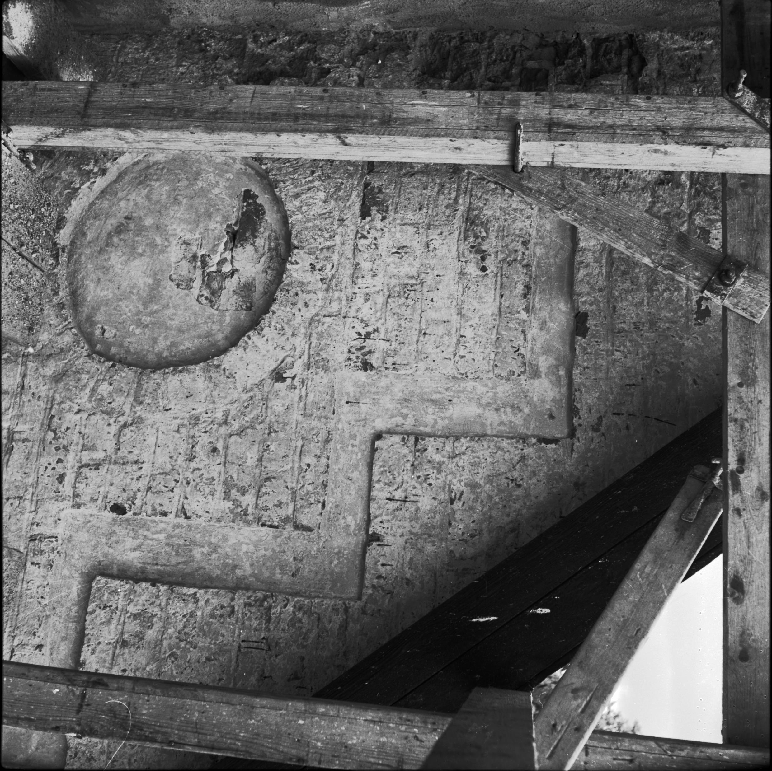 Beskrivning: Långhusets västra fasad, blinderingar, under arbete med slätputsning av kyrkan.