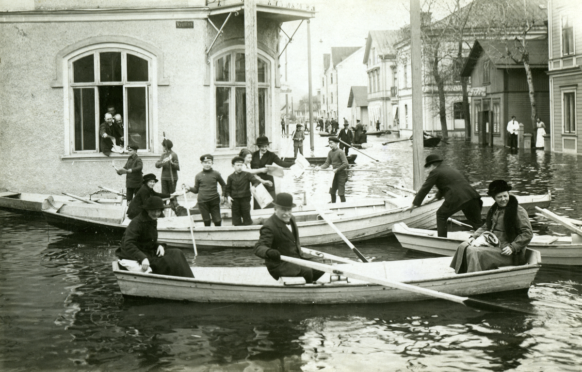 Översvämning i Bollnäs år 1916. Nygatan. Tidningar delas ut genom fönstret. Många barn hjälper till i båtarna.