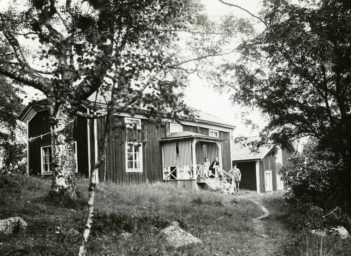 Vexsjö, "Berge". Bollnäs. Två kvinnor sitter på förstukvisten till en gård. En man i hatt står nedanför trappen.