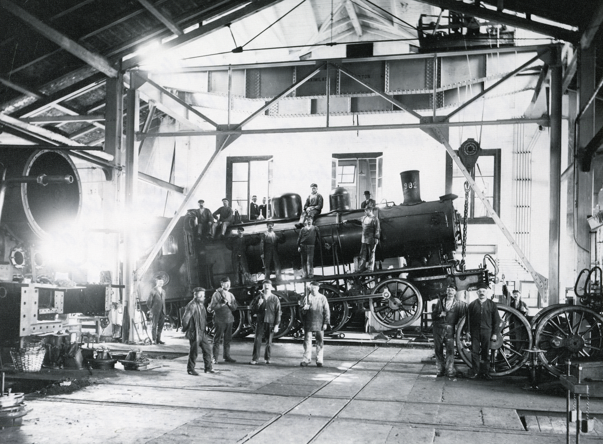 Ett grupporträtt av arbetarna som arbetar med ett upphöjt lok. I taket syns upphängningen av loket, i golvet syns rälsen och till höger vagnshjul.