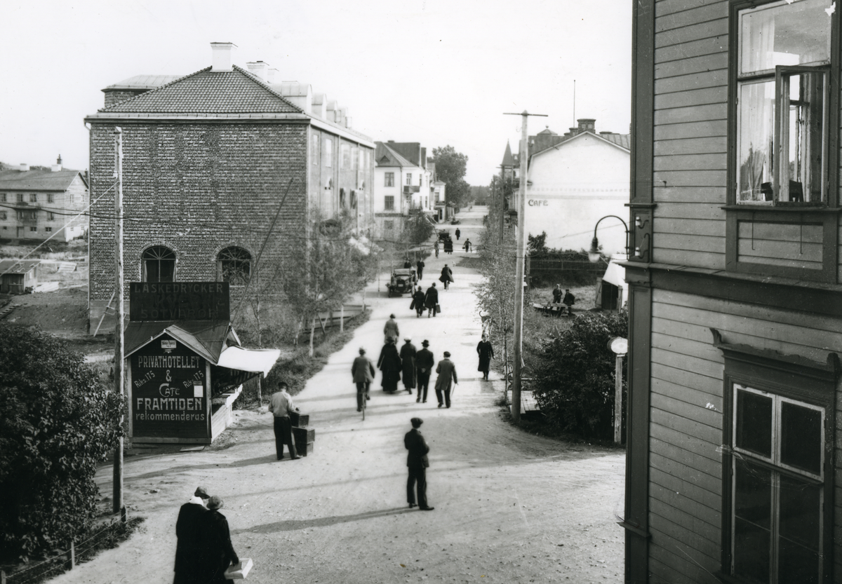 Stationsgatan från järnvägsstationen m. järnvägshotellet i den högra bildkanten. Bortom hotellet skymtar den gamla fältskjutbanan och allra längst bort på den högra sidan syns Baptisktkyrkan (fr 1896). T.v. Fredrik Törnbloms kiosk som revs för tingshuset 1930. Tegelhuset bortom kiosken blev sedan ett affärshus.