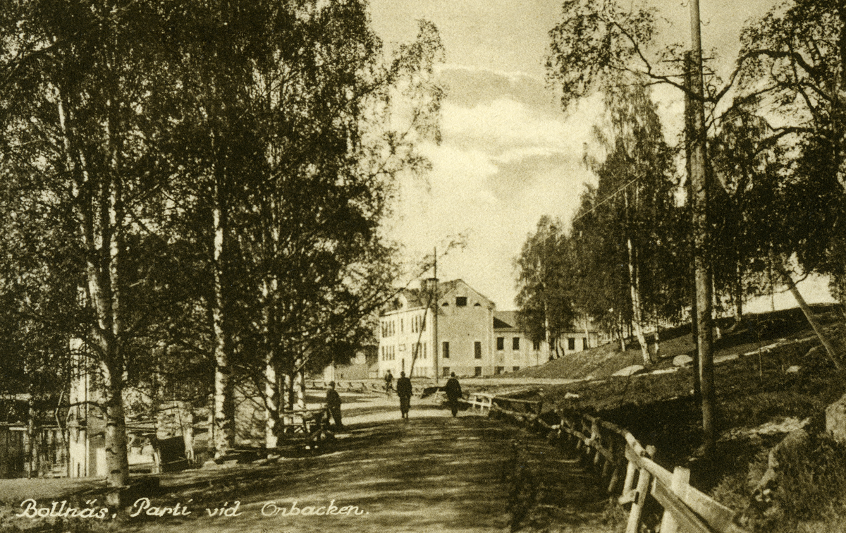 Bollnäs. Parti vid Onbacken. Två cyklister och två fotgängare möts på vägen.