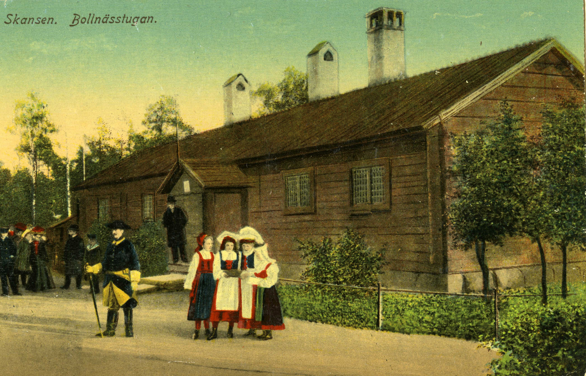 Vykort från Skansen. Bollnässtugan uppfördes omkring 1750 på hemmanet nr 11 "Knubbgården" i Herte by, Bollnäs socken i Hälsingland. Bollnässtugan flyttades till Skansen 1892.